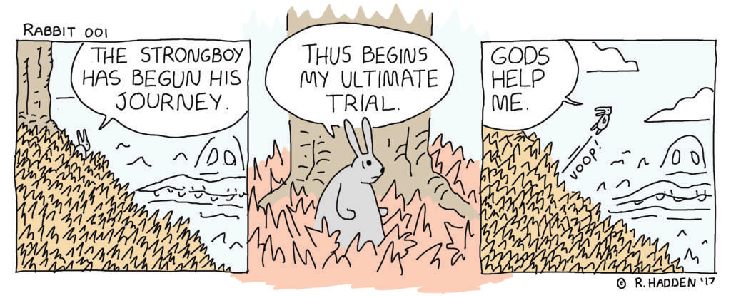 As a patron, you get access to new issues as they are released, either as PDF or printed comic. Every month! You also get to read his “bonkers” strip Rabbit. And if you really go all out, you can get an original drawing every month.