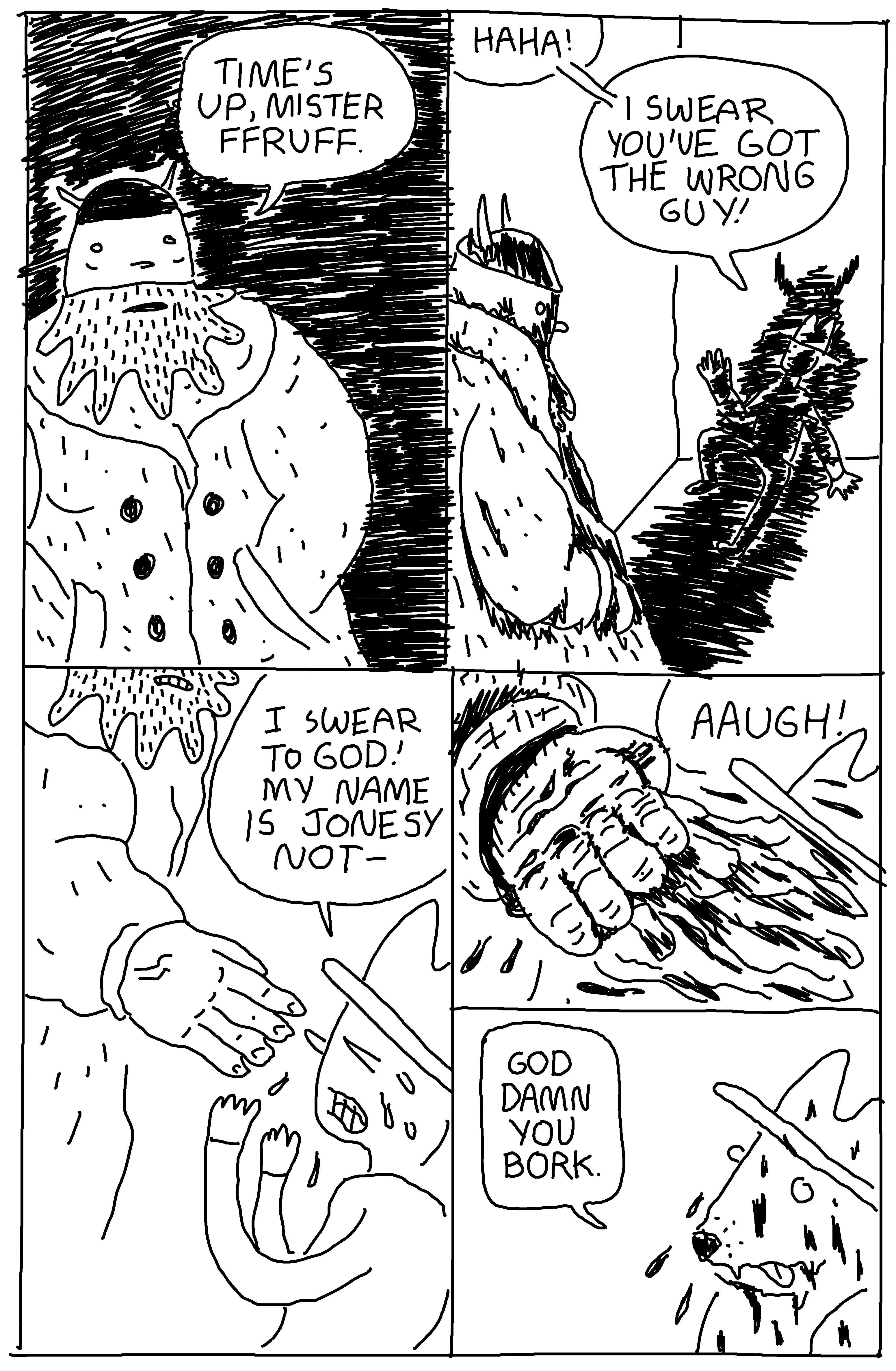 I guess if I didn’t love a character, they probably wouldn’t be in the comic. I will get really excited about odd new characters, though. Currently there’s this guy that I’ve barely used; he’s a dog, alien, kinda god guy named Mr Fruff. He’s hardly done anything yet, but I want him to be a kinda Peter Lorre in Casablanca kinda guy. Like a down-on-his-luck, noi, trickster god. We’ll see.