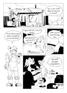 First page of The Junk Hyenas DinerThe Junk Hyenas Diner started in 2013 when Chu started at CCS and posts two black-and-white pages each week. The sci-fi story follow two mutant hyena siblings, Lucky and Guff, as they run their diner on the post-apocalyptic planet Growl.