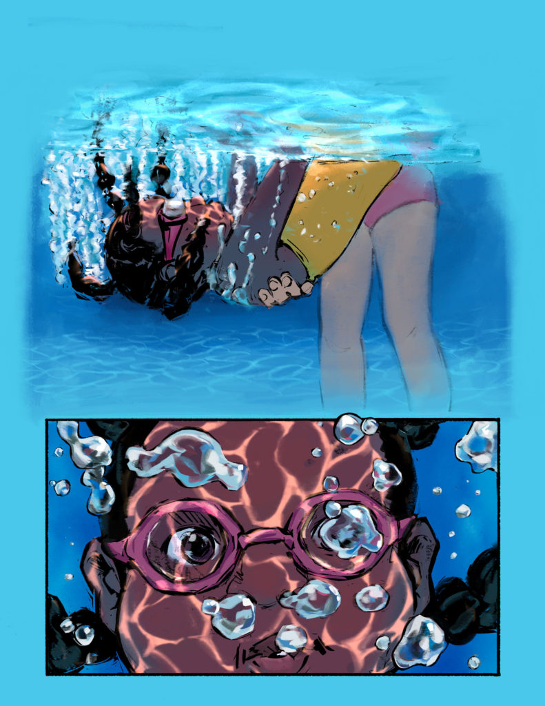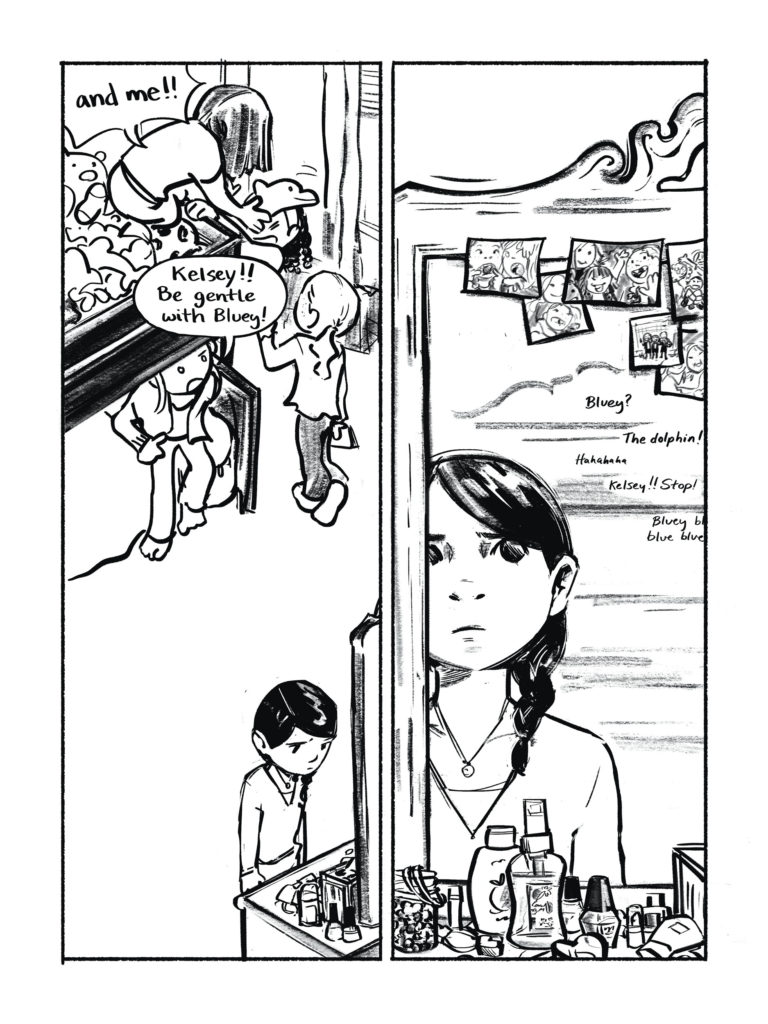 In its entirety, Between follows the trajectory of a friend group exclusively through their sleepovers, from when they’re young kids to older teens. I’d like to explore the messier aspects of adolescent relationships— codependency, microaggressions, sexuality, and awkward feelings. Things mold and change in a way that’s natural— people grow apart and come back together again. There will be five chapters in total, with each one taking place in a different year. What I’ve shown is the finished linework of the second chapter.