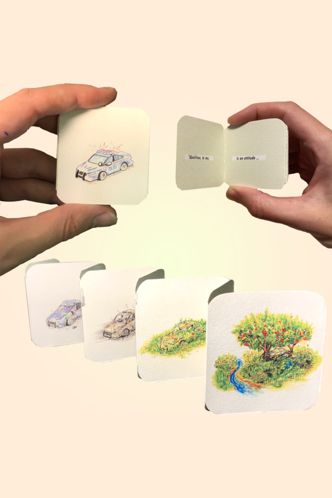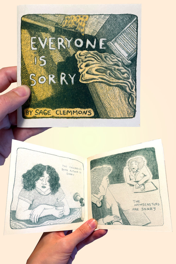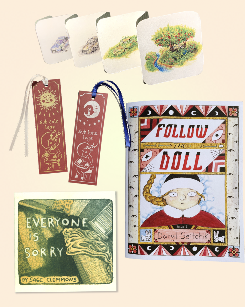 So far we’ve published Follow the Doll, Issue One by Daryl, and a tiny abolition zine [Abolition Is a Presence] from Dan that’s raising money for Critical Resistance. We’re also carrying a screen-printed bookmark by Cuyler Keating ’19, and our latest is a risographed poetry comic by Sage Clemmons ’20 called Everyone Is Sorry.