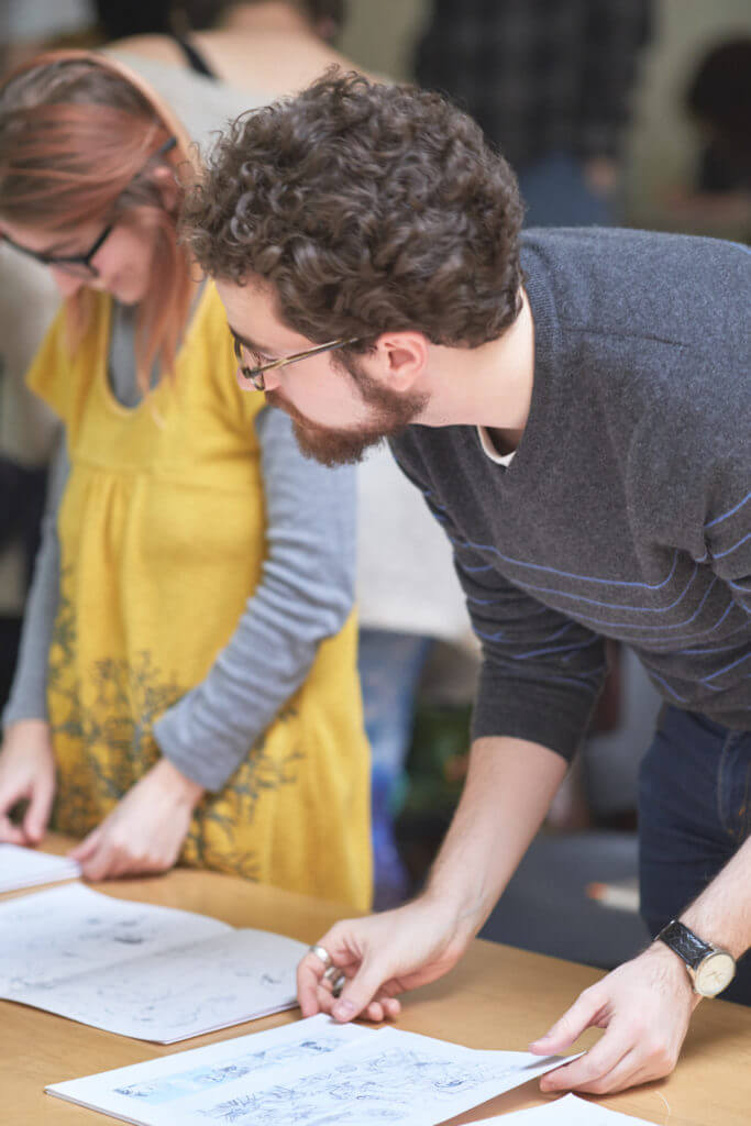 Studio time each day allows students to work on their own concepts and get feedback from the instructors. By the end of the week, each student should have a big stack of finished pages.