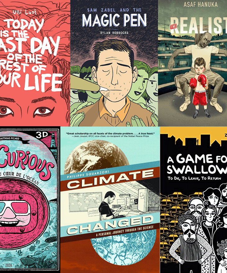 Tags: A Game for Swallows, agent, An Iranian Metamorphosis, Ariol, Asaf Hanuka, Blutch, cartoonstudies, Claudia Ahelering, Climate Changed, David B, Dylan Horrocks, Emmanuel Guibert, First Man, Ghetto Brother, Incidents in the Night, Jim Curious, Julian Voloj, Laika, Mana Nevestani, Marc Boutavant, Matthias Picard, Nicolas Grivel, Peplum, Philippe Squarzoni, Pika Edition, Sam Zabel and the Magic Pen, Simon Schwartz, The Realist, Today Is the Last Day of the Rest of Your Life, Ulli Lust, Zeina Abirached