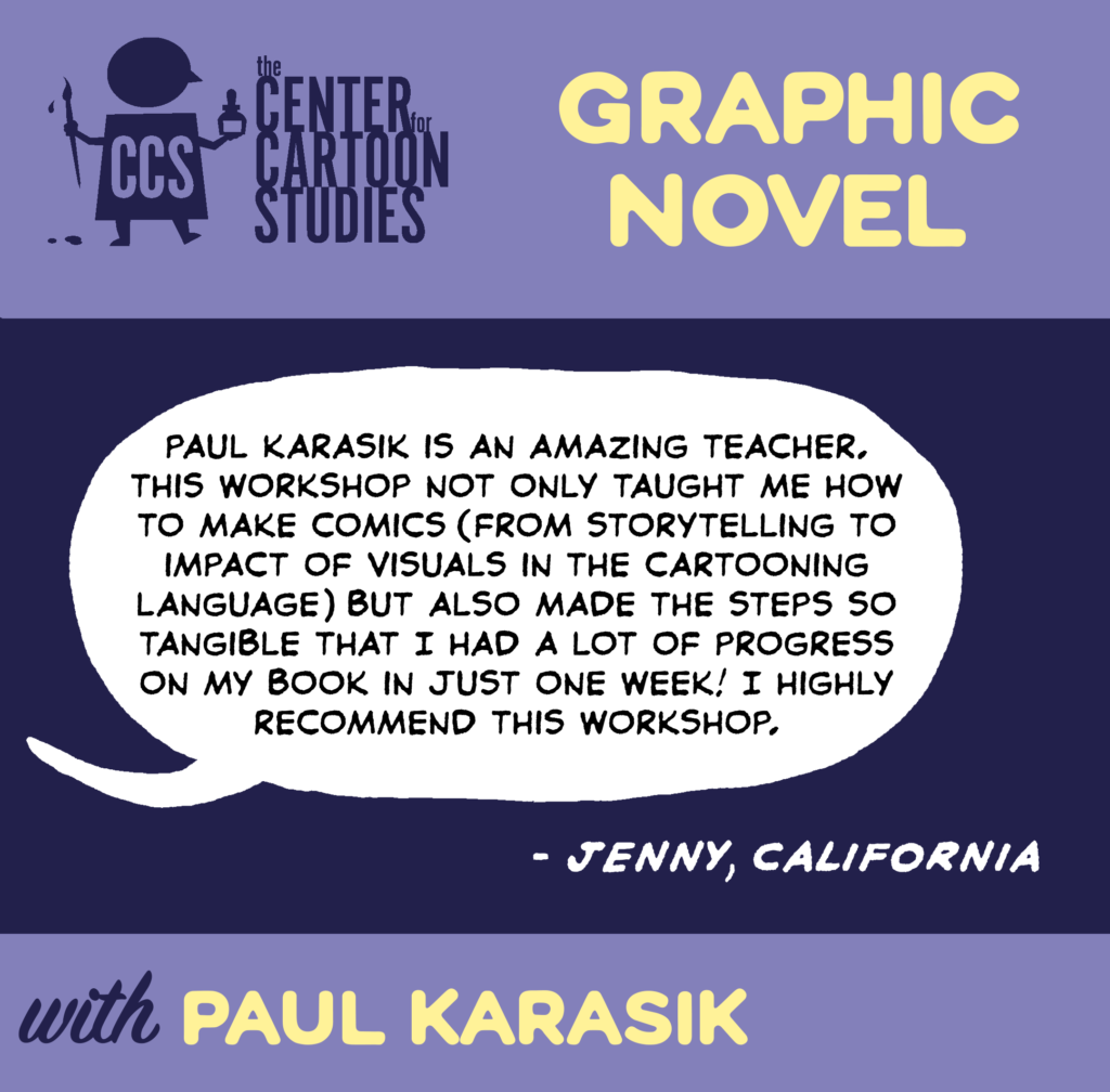 Do you have the beginnings of a graphic novel but need some help getting it off the ground? Do you have a story, fiction or nonfiction, you’ve always wanted to tell using comics? Is your cartooning stuck in a rut, ready to move up to another level? Put everything else aside and only work on your comics for a week straight! Workshop instructor Paul Karasik is a cartoonist (The New YorkerCity of Glass), a comics scholar (I Shall Destroy All The Civilized PlanetsHow To Read Nancy), and a renowned teacher who really knows how to take good cartoonists and make them better. During the five-day workshop, students will participate in lectures, collaborative exercises, book discussion sessions, events, and group critiques, with the goal of producing the first draft of a longer comics project.       Key Takeaways: