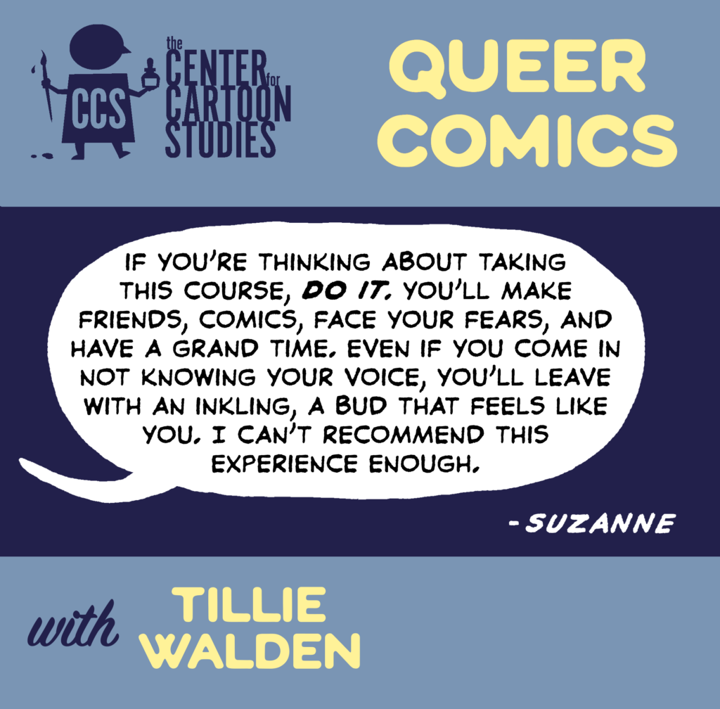 Optional for-credit: Workshop can be taken for 2 undergraduate credits. Please check with the Program Chair or Registrar at your college or university before registering to see if the credits will be accepted. To enroll for-credit, students must select the additional for-credit tuition of $400 at registration and have an official transcript from their current institution sent to: Registrar The Center for Cartoon Studies PO Box 125 White River Junction, VT 05001