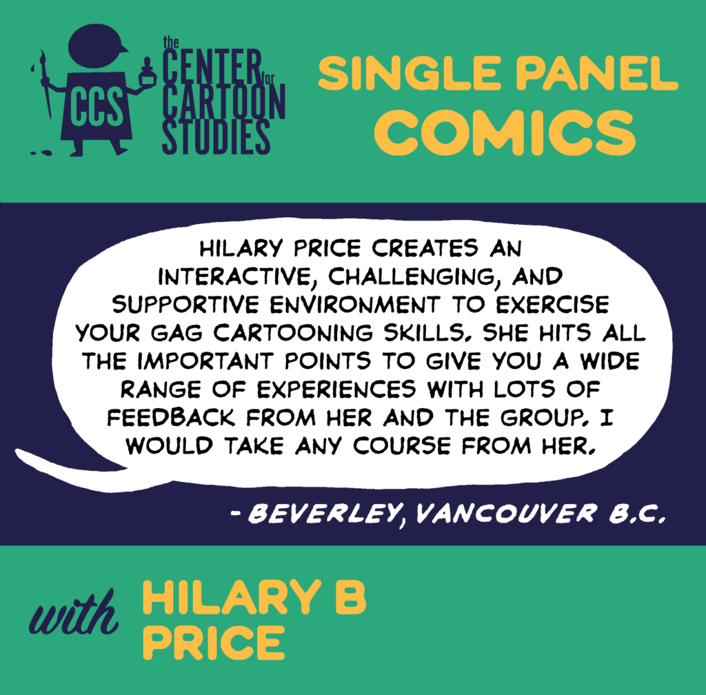 Cartoonist Hilary Price, known for her syndicated strip Rhymes with Orange, leads this five-day intensive workshop which examines the essentials for producing your own single panel comics – characters, environment, plot and the gag. A combination of lectures, prompts, or exercises, and studio time provides an in-depth look into the form and an opportunity to leave with completed works. Writing and Drawing Single Panel Comics is for both beginner and advanced adult and college students.